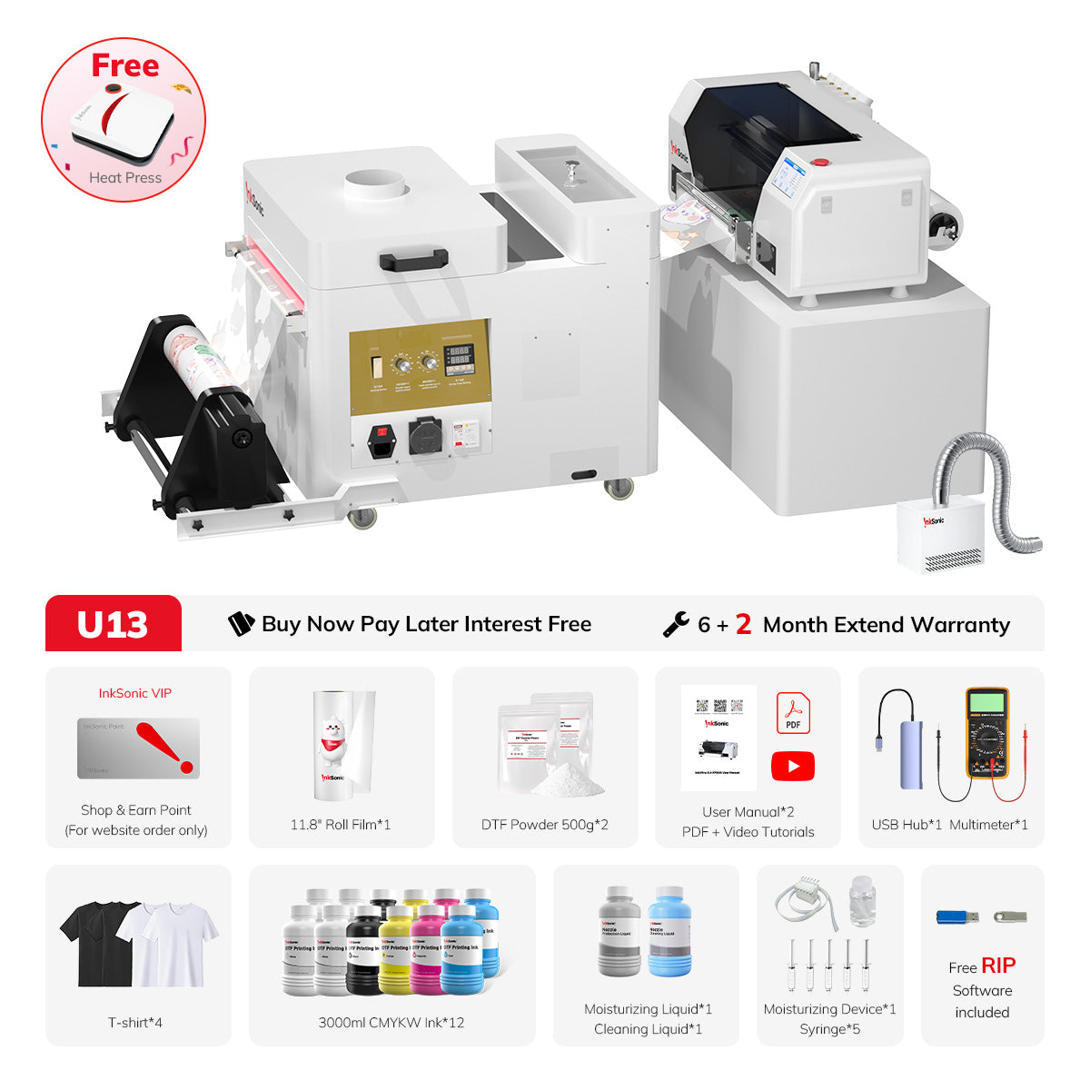 - Ultimate Super-Fast 3 in 1 DTF Printing Solution: InkSonic U13 DTF printer XP600 A3 could be equipped with automatic powder shaking and drying machine, which can dry a A3 T-shirt DTF film in 3 minutes. The powder shaker and oven machine with automatic film rolling function ensures that all inks in the film could be shaked enough after mixed with powder and cured instantly, which will double daily output of your T-shirt printing business while reducing lots of labor cost.