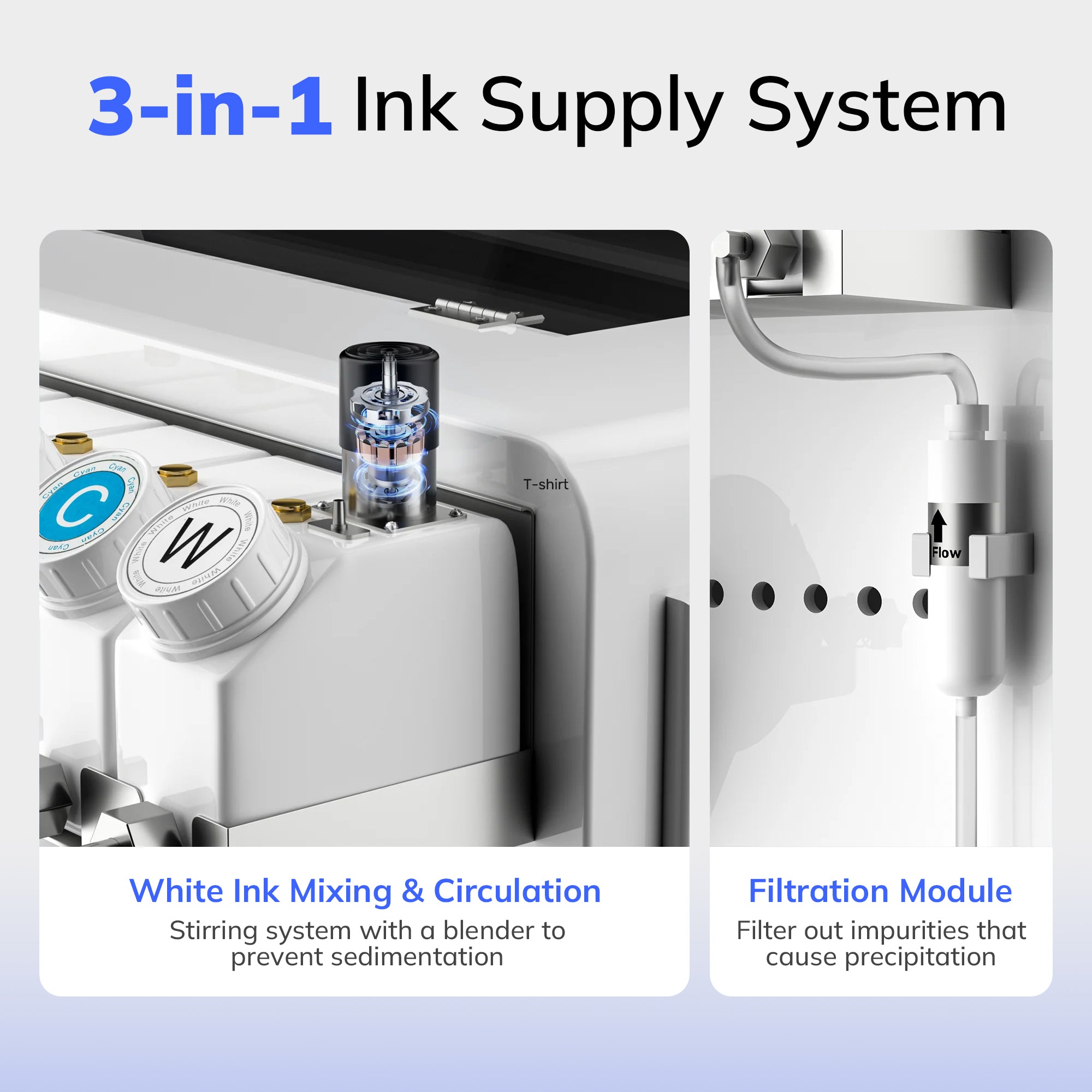 When paired with a powder shaker, the system automates film feeding, collecting, powder shaking, curing, and white-ink circulation. This setup cuts down manual work and keeps your production running smoothly and efficiently.